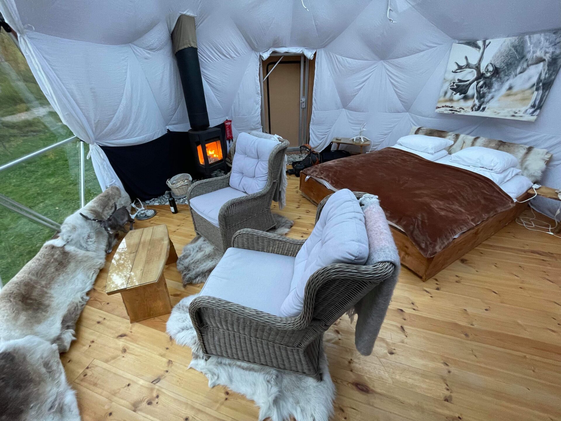 Vi får det til med vår glamping Dome. Et stort vindu foran og et takvindu gir deg utrolig utsikt over villmarken og den uendelige himmelen!