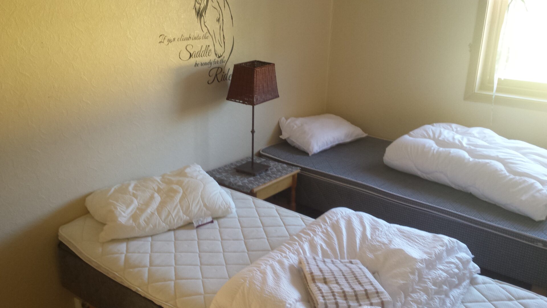 Vi tilbyr overnatting på gården, både under rideleir eller i privat leilighet for de på rideferie. Vi har hatt gjester fra hele verden som har benyttet seg av dette unike tilbudet. I år vil det være ekstra smitteverntiltak med nøye desinfisering (men du vil mest sannsynlig være mer omgitt av natur og hester, enn mennesker).